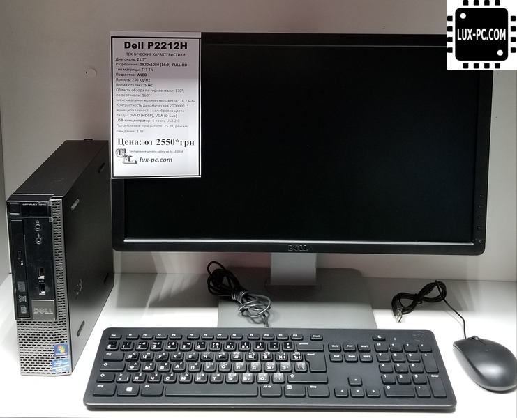 - Комплект поставки: Системный блок Dell , монитор Dell 2212, клавиатура, мышь, кабеля подключения